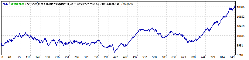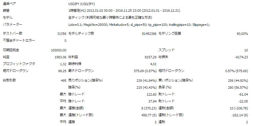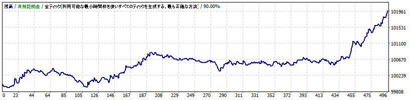 デフォルトの条件にて、ドル円1時間足で2012年1月~2016年11月までの5年間でバックテストを行ってみた結果が以下です(スプレッド1.0Pips)。横ばい時期が続いていますが、直近では利益を積み上げられていることがわかります。
